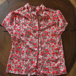 This elegant blouse features a striking red black, brown and white color palette, with zebras 🦓 complemented by a sophisticated mandarin collar. Designed with a classic blouse style, it offers a timeless look perfect for any occasion. Fun tie detail on back of the top at neckline. Tie as bow or knot and let hang. Super cute with the zebra print details! Like new!