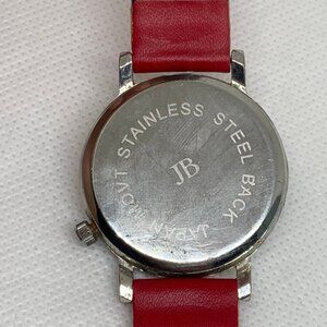 JB cardinal bird floral dial women watch 33mm silver tone case quartz analog red leather band fits up to 8”, in good used condition battery installed
