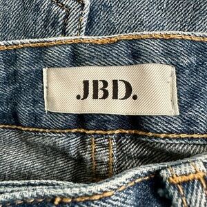 JBD, JUST BLACK DENIM SHORTS. DISTRESSED WITH SIDE STRIPES. SIZE L