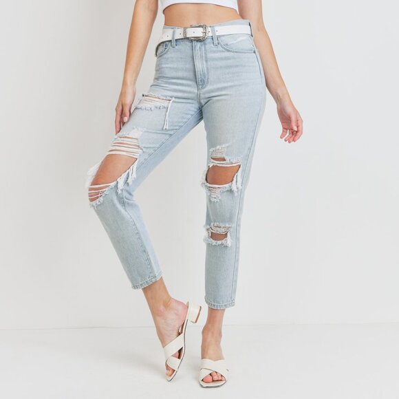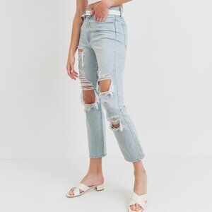 JBD. Just Black Denim Layla Destroyed Girlfriend High Rise Light Wash Crop Pants