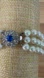 The bracelet typically consists of three strands of faux pearls, often described as having a creamy white color. The clasp is a prominent feature, often incorporating a blue faux sapphire or Swarovski crystal centerpiece, encircled by clear rhinestones.