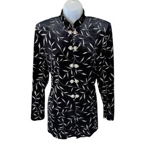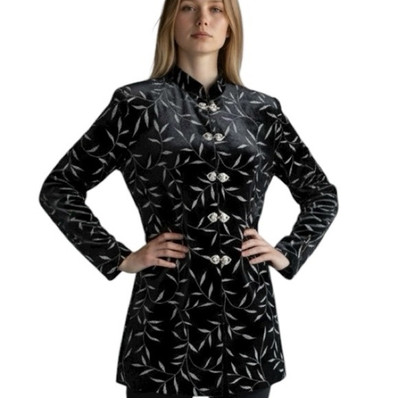 This JBS velour blazer blends steampunk drama with elegant Edwardian flair. The plush black velour shimmers with a silver leaf design that catches the light beautifully. Ornate metallic frog closures, a mandarin collar, and subtle shoulder pads create a structured, refined silhouette. Perfect for holiday styling, cosplay-inspired looks, or evening wear.