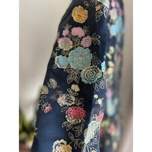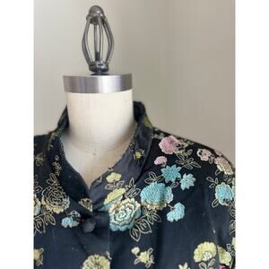 Stunning vintage black satin jacket with multicolor floral embroidery in a traditional brocade style. Features a mandarin collar, frog button closures, and full-length sleeves. Ideal for layering over dresses or elevating a casual look. Some signs of wear on sleeve – see photos.