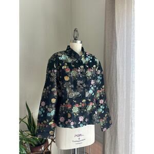 #vintagejacket #brocade #floraljacket #mandarincollar satin jacket embroidered floral brocade button front black traditional vintage layering retro blazer