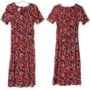 JBS Ltd Vintage Floral Faux Button Front Dress Short Sleeve Women's 10 Black Red Rose Prairie Cottage Core