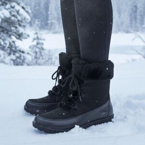 Built for cold-weather adventures and everyday utility, this boot blends rugged durability with soft winter comfort. The outdoorsy practicality, arctic expedition mood, winter cottage warmth, and subtle gorpcore influence, wearable look for daily outfits. The water-resistant faux suede and vegan leather exterior offer protection for snowy commutes and crisp trail walks, while the plush faux-fur shearling lining wraps the foot in insulated coziness inspired by hygge living. The All-Terra traction outsole delivers stability on wet, icy, and uneven terrain. Perfect for winter travel, mountain-town weekends, or simply embracing a cozy-core lifestyle, this boot brings together warmth, resilience, and a touch of wilderness charm.