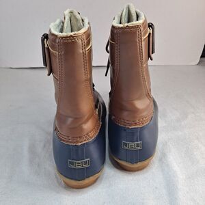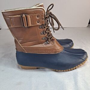 The JBU By Jambu Nova Scotia Duck Boots are a stylish and functional choice for women in size 9M. These navy blue and brown boots feature a round toe, lace-up closure, and a flat heel for all-day comfort. The mid-calf shaft style and waterproof rubber outsole make them perfect for casual wear in all seasons, while the faux fur lining adds warmth during colder weather. With a solid pattern and buckle accents, these boots combine practicality with a touch of style, making them a versatile addition to any wardrobe.