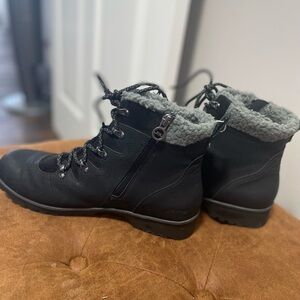 Stylish black winter boots with cozy faux fur Sherpa lining. Perfect for cold weather and with memory foam. A comfortable and warm boot for those cold days. Bought them this winter and only wore them 3 times, they just aren’t my style of boot. Has great tread on them and they are waterproof! Needs a new home! Make me an offer!