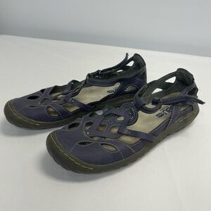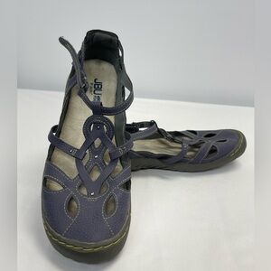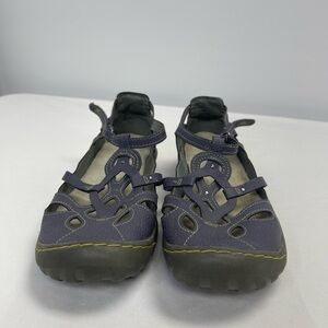 Blue shoes with grey soles. Velcro closure at the ankle. Cute cut out design on the top. Fully closed round toe. Used but in excellent condition.
