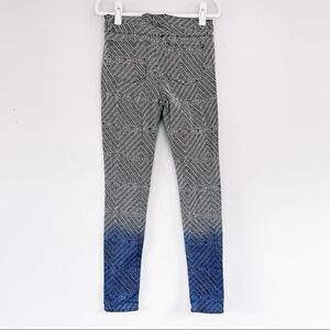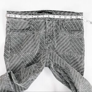 The classic mid-rise super-skinny fit gets a definitive makeover for the season with a unique linear graphic print that's tip dyed at the hem. Features a zip fly with button closure, front and back pockets, and blue ombre dip dye ankles over black and white graphic printed pants.