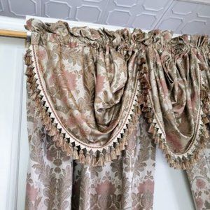 JC Penney Drapes Waterfall Valances 100Wx85L Tan Floral Jacquard Lined Vtg 7pcs