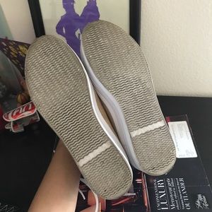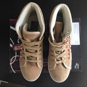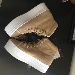 Preloved. Jeffrey Campbell Play Studded Homg Platform Sneakers. Size 8. In my opinion, it runs half a size small so it should fit size 7.5 Taupe suede. Rose gold studs. 2 inch platform heels. Dirt marks. Light scuffing on sole. Comes with original box. No returns.
