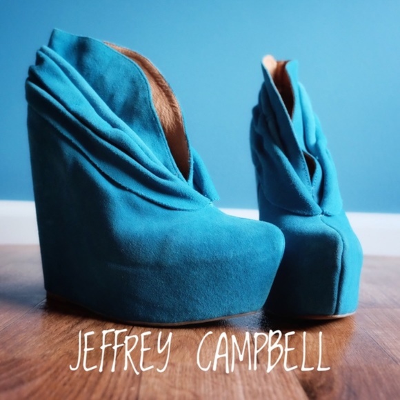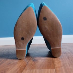 Slip-on style wedges in teal. Cross-hatch stitch up the heel - 5 1/2" with a 2" platform (comparable to a 3 1/2" heel). EUC and a great way to spice up a simple black dress. Ask me any questions!