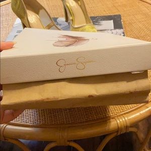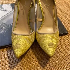 Super cute, unused,Never worn, sheer electric yellow and tan fine mesh, embroidery micro, very small glue detail on right shoe(barely noticeable)see pic great condition. Original box is damaged(see pic)