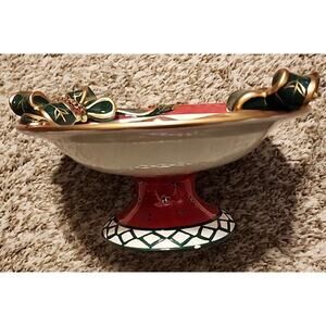 This medium-sized bowl features a striking design with a red ribbon and greenery motif around the rim, making it a perfect accent piece for Christmas and the holiday season.