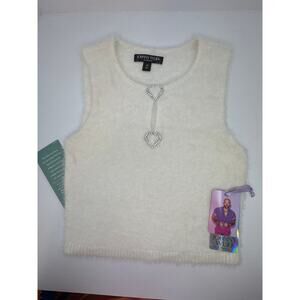 JCPenny Juniors Fuzzy Knit Top Medium Cream Rhinestone Heart Closure NEW