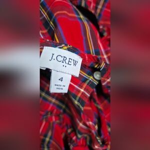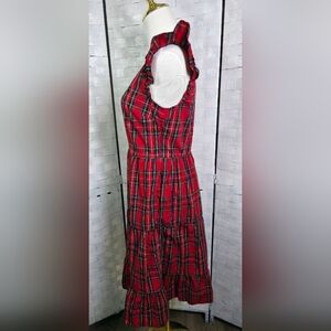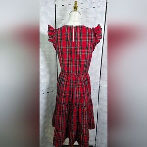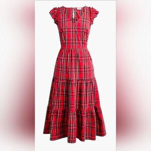 J Crew Factory red Tartan flutter-sleeve midi dress a festive and versatile dress often highlighted for holiday and winter wear. It typically features a V-neck, flutter sleeves, tiered skirt with side pockets, and a red, black, yellow, and blue tartan plaid pattern. In great condition