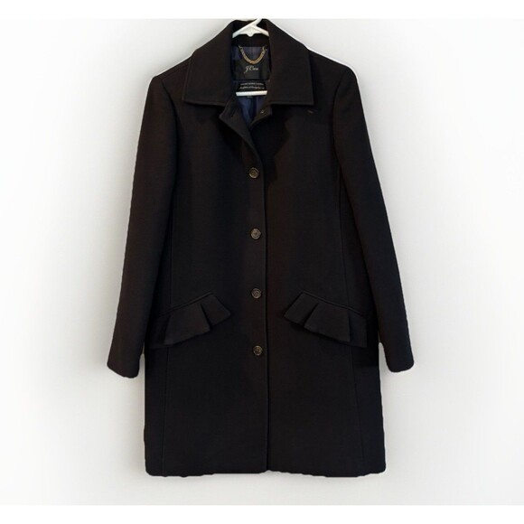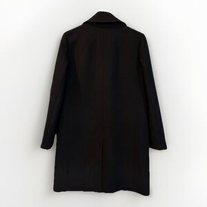 The J.Crew Black Classic Lady Day Coat is a sophisticated and stylish mid-length overcoat made from Italian double cloth wool. Bust 19.5, length 36. This coat features a classic solid black color with a long sleeve and button closure, perfect for various occasions such as travel, parties, casual outings, workwear, and business events. It is lined with polyester and has convenient pockets for added functionality. Timeless style and quality craftsmanship.