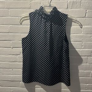 JCREW BLOUSE EUC SIZE 6 SLEEVELESS NAVY BLUE POLKA DOTS NECK RUFFLE LENGTH: 25in BUST: 37in