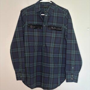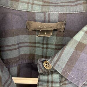 JCREW Beaded Popover Top Women 2 Green Blue Plaid Long Sleeve Flap Pocket