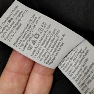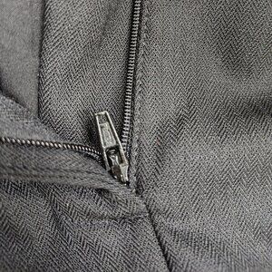 Straight leg classic trouser. Wool blend fabric, synthetic liner, new with tag (been sitting in the closet in the hopes that my job will have a strict dress code so I can wear nice suits, and it never did lol) - Measurements: Waist 18", Inseam 26", Leg opening 9.5", Rise 14.5. The fabric is not stretchy, feels light but warm, requires minimal care (they basically don't wrinkle). Color is off black/ warm dark grey.
