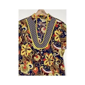 J.CREW FLORAL PRINT BOHEMIAN YOKE NECK TOP SIZE M. Bright bohemian blue and yellow floral, this top has a contrasting pattern yoke neckline. Short sleeves with elastic and a slight ruffle. L 25.5, P2T 21.5"Pre-owned no flaws.