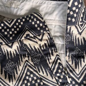 The J.CREW shorts with a bold, geometric pattern. The design features a combination of black and white colors, creating a striking contrast. The pattern consists of zigzag lines, diamond shapes, and other geometric elements, giving the shorts a tribal or ethnic-inspired look. The fabric appears to be woven, and the shorts have a fitted, tailored shape.