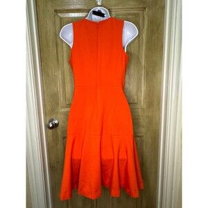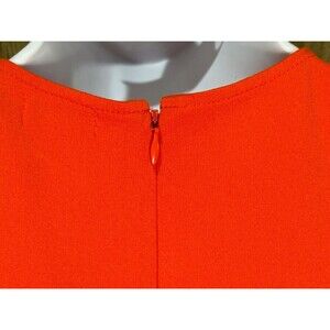This J.CREW dress is a stunning addition to your wardrobe. The bright orange color and sleeveless design make it perfect for summer and spring occasions, whether you're traveling, attending a party, or just going about your day at work. The dress features a crew neckline, zip closure, and a ruffle hem for a playful touch. The dress is made of a high-quality knit fabric that panels the entire dress, giving it a structured and flattering fit. The fit and flare style is accentuated by the trapeze and swing style, making it a versatile piece that can be dressed up or down. The dress is made of a blend of nylon, viscose, and elastane, providing a comfortable and stretchy fit.