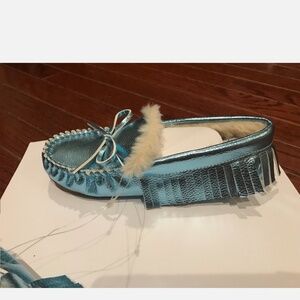 J.CREW GIRLS' GIRLS' METALLIC MOCCASINS. COLOR: METALLIC BLUE. SIZE: K5. ITEM # J8032.