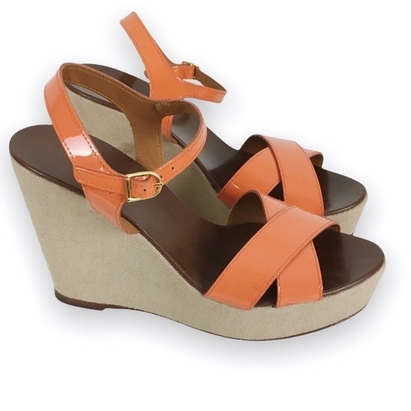 J.Crew orange Lila patent leather wedge platform sandals. Canvas covered heel & platform. Back of heel is approximately 4" and platform is approximately 1.25". Size 7.
