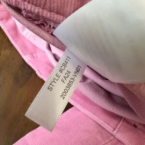 These J.CREW Lizzie Patch Pocket Corduroy Pants are in a size 33P for women. They are high rise with a wide leg style in a pink color. Made of spandex and cotton, they feature a button and zipper closure, with accents of button and zippered pockets. The pants are designed with comfort and stretch in mind, perfect for casual or travel occasions.