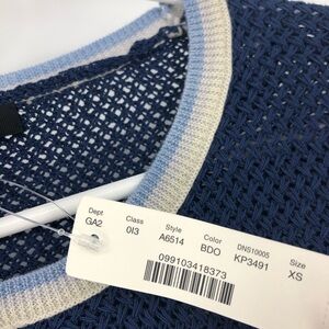J.Crew Blue and White Crew Open Knit Sweater. New with tags. Size XS. Style #A6514. 83% Cotton and 17% Nylon. 100% Merino Wool Collar and Cuff.