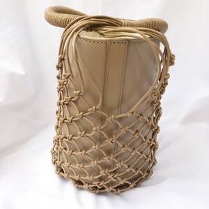 • Cow leather bucket bag with canvas lining, scrunch-able drawstring closure, netting overlay was woven by hand.