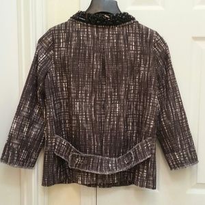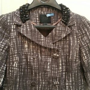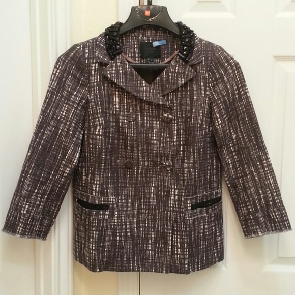 Black and white double breasted jacket with jewel accents (RARE) around the notch collar. Button closure. Style is boxy fit. Back has an inner pleat for extra movement. Button strap at back. 100% thick Cotton. Lining 100% brown Acetate. Body length 24.5". Sleeve length 21". USED TWICE. NO DAMAGE!! Already dry cleaned. Beautiful and Sophisticated.