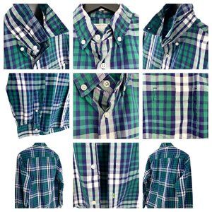 Description: This Re-Imagined by J.Crew shirt has an allover tartan plaid pattern in alternating green, blue checkered style and symmetrical with vertical stripes. On this Re-Imagined Indigo Plaid, the fabric consists of sustainable cotton in consciousness of the mission for planet and people. In the details of Re-Imagined by J.Crew plaid shirt, the collar consists of a button down collar with left chest pocket and single button cuff with upper wrist button. Along the button placket, there are specially stitched embroidery around the button with a neon green stitching around the last button. Style this J.Crew Re-Imagined Indigo Plaid shirt with solid blue or green blazer, cable knit sweaters, denim jeans, cargo corduroys or shorts. Modern Style | Preppy Style | Prep Fashion