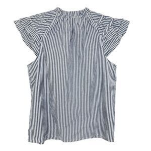 The J.CREW Striped Flutter-Sleeve Top is a stylish and versatile blouse perfect for casual or business occasions. Made from lightweight cotton material, this top features a crew neck with button closure, short flutter sleeves, and a ruffle accent. The classic blue and white stripe pattern adds a timeless touch to the top, while the regular fit ensures a comfortable and flattering silhouette for women in size M. Perfect for all seasons, this blouse is a wardrobe staple that can be easily machine washed for convenience.