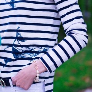 Whales are disappearing rapidly due to pollution, climate change and overfishing. Hand-sketched whale images on this striped tee was originally made to support the Wildlife Conservation Society.