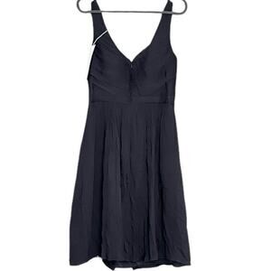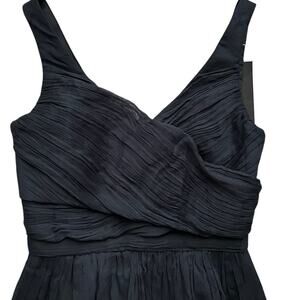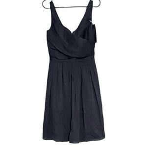 100% silk short sleeveless dress. Features an empire waist and a wrap front design with a sweetheart neckline. Pleated accents and a zipper closure. The dress is dark navy midnight blue, almost black. Perfect for formal occasions such as weddings and cocktail parties.