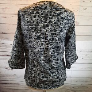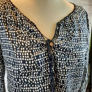 Navy and ivory dot patterned lightweight bell 3 /4 sleeved tassel tie top. Cute threaded trim around neckline. Great condition. Boho
