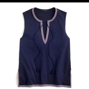 Navy cotton tank top with red white and blue trim. Side slits, split neck with tie. Great condition