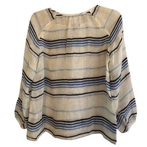 Coastal J.Crew 100% Linen Sheer Peasant Blouse with Indigo/Navy/Pastel Blue woven Ribbon Stripes. Beachy lightweight Pullover with 3/4 Raglan baloon sleeves, flattering Keyhole Neckline and Cuffs.