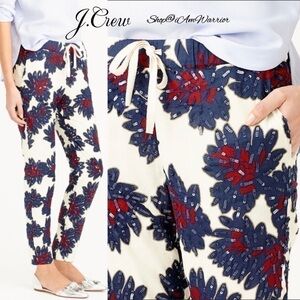 Blogger favorite J.Crew 2 piece lightweight drapey cotton voile sleeveless top & pull-on jogger pant set in gorgeous navy blue & red abstract firework design with navy sequin accents are perfect worn together or as separates. VGUC, some loose/missing sequins, but nothing that affects the design aesthetic. Pants are lined with elastic waist & drawstring closure, top unlined with partial button closure. Top retailed at $118. Pants retailed at $128. Combined retail of $246, generously priced at $50 off! Both in size 6, see photos for measurements.