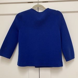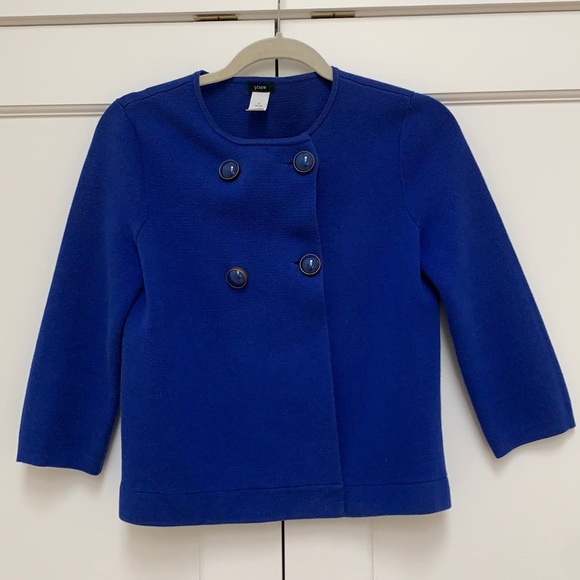 J. Crew bright blue jacket double breasted. Older but only worn once. I just dry cleaned it. Can be washed 100% cotton.
