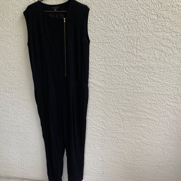 Gently worn, no rips or stains, no flaws. J. Crew black jumpsuit. Sleeveless, zipper and snap closure, slant pockets on each side of pant. 14T FOR TALL WOMEN, 5'9", or above. Approximate measurements bust is 40" across, waist is 35",full length from shoulder top shoulder is 64". and leg opening is 5". . SEE ALL PHOTOS, THEY ARE THE DESCRIPTION.