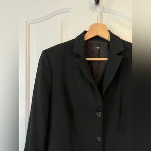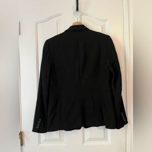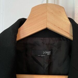 This black blazer is beautiful and in excellent condition. The only flaw is that the fabric and size tags have been cut out. However, I found this exact blazer and the fabric is 100% wool. I also believe that it is a size 4 or 6 / Medium. I am a solid size 6 and a medium at J.Crew and it fit me perfectly. It is incredibly flattering. If I had any need of a blazer, I would definitely be keeping it (unfortunately I don't need to wear a blazer with my usual day to day leggings very often!) Otherwise it is in beautiful condition. It is marked as a petite, but it does not necessarily fit super petite, as it has a longer fit. Check measurements to see! This is perfect for any professional environment -- great career piece. But it also could be cute with a pair of jeans and sneakers. This is a great staple piece.