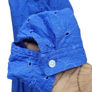 Effortlessly chic and timeless, this J.Crew Blue Eyelet Shirt Dress (Size 10) is a wardrobe staple for any season. Crafted from 100% cotton with a soft, breathable lining, this dress features a button-down front, collared neckline, and long sleeves with button cuffs for a polished look.