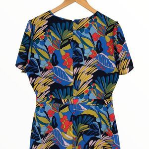 Beautiful bold tropical floral print dress, with a surplice v neckline and faux wrap skirt. Lined, with short sleeves, hidden back zip and hook and eye closure, banded waist.
