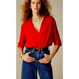 J.Crew bright red popover blouse, made from lightweight, breathable 100% linen. Features a collared neckline, relaxed silhouette, and 3/4 sleeves—perfect for warm weather or layering. Never worn and in excellent condition.