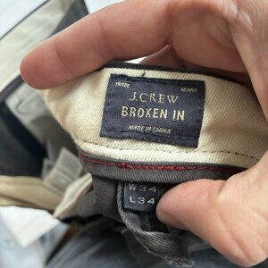 J.Crew “Broken-In” chinos, dark gray, size 34x34. Comfortable, worn-in look and feel. Fair condition with mild wear.