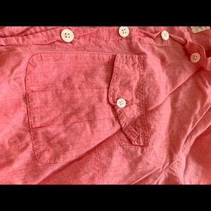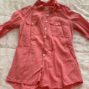 JCrew salmon/Coral button up shirt. It tons on sleeves and mid way up sleeve to roll up if desired. Lightweight, perfect for spring!
